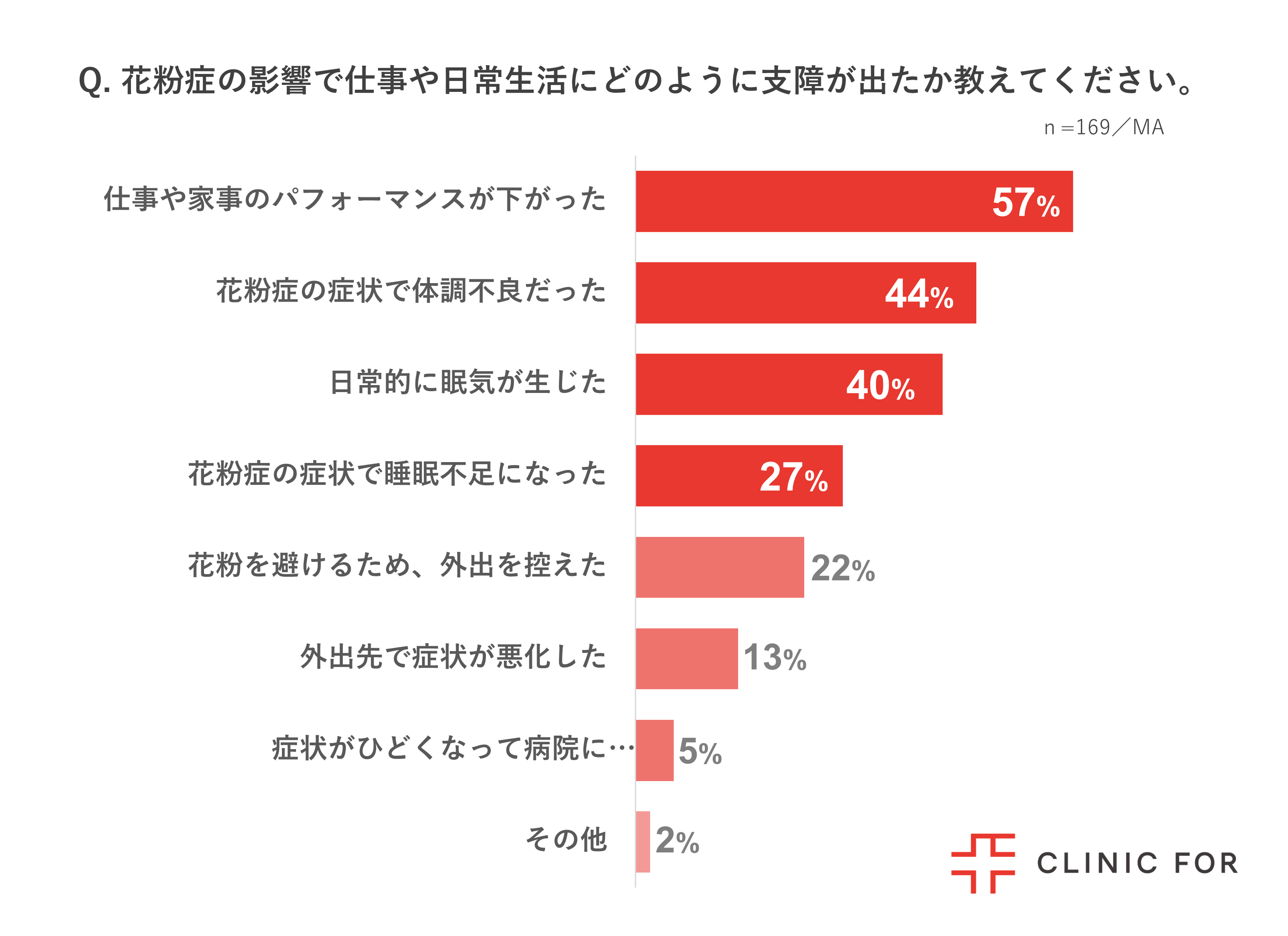 具体的な内容としては、「仕事や家事のパフォーマンスが下がった(57%)」が最も多く、次いで「花粉症の症状で体調不良だった(44%)」「日常的に眠気が生じた(40%)」が続きました。