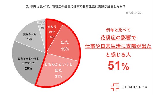 春花粉症の331名(今年初めて発症した人を除く)を対象に、例年と比べて、花粉症の影響で日常生活に支障が出たかどうか調査しました。その結果、「支障が出た」と回答した人は51%と半数以上にのぼりました。