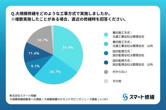 「大規模修繕をどのような工事方式で実施しましたか。※複数実施したことがある場合、直近の修繕時を回答ください。」との質問に対して、責任施工方式で実施したと回答した人が全体の約6割(「分からない」を有効回答から除いた場合は約74%)という結果になりました。