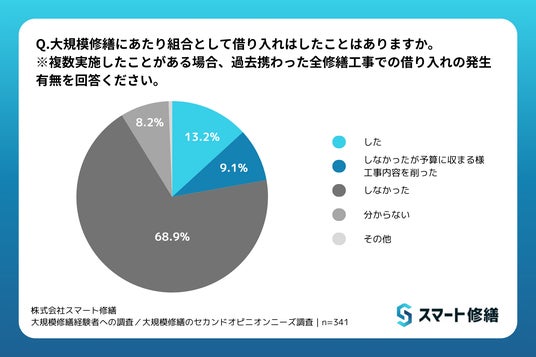 「大規模修繕にあたり組合として借り入れはしたことはありますか。※複数実施したことがある場合、過去携わった全修繕工事での借り入れの発生有無を回答ください。」との質問に対し、13.2%の人が「した」と回答し、大規模修繕工事を行う10棟に1棟が借り入れをしていることがわかりました。さらに、9.1%の人が「しなかったが予算に収まる様工事内容を削った」と回答。本来、大規模修繕工事を含めた修繕は、建物の劣化に応じて行うべきものであるため、必要な工事を削らないように専門家の精査が必要です。そして、必要な工事を削らないためにも定期的な長期修繕計画の見直しなど、適切な資金計画を立てることも重要です。