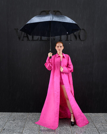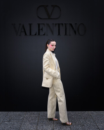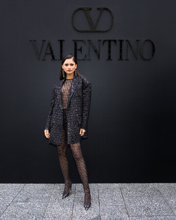 ゼンデイヤは、ショーで発表された最新の2023年春夏コレクション「アンボクシング ヴァレンティノ」より、Vロゴが連続するアイコニックなパターンが特徴の「トワル イコノグラフ」のルックを纏った姿を披露しました。