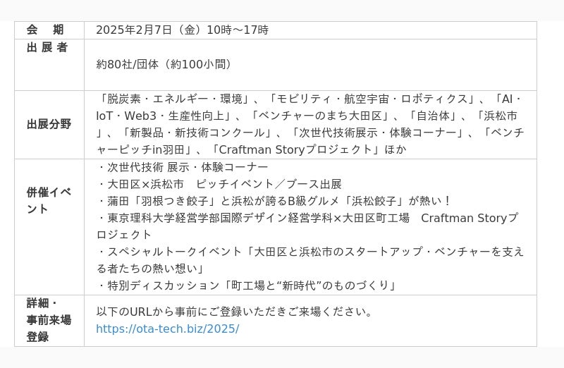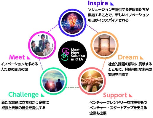 「Meet」「Inspire」「Challenge」「Dream」「Support」をキーワードとして、社会課題を解決する新しいソリューションを世の中に生み出す全国のスタートアップ・ベンチャー企業などが「ものづくりのまち 東京大田区」に集結。日本産業の復活とさまざまな「出会い」が新しい世界を創っていくことを目指します。今回は、日本有数のものづくりのまち「東京大田区」と「浜松市」がタッグを組んで、本イベントを盛り上げます。イベント内では様々なコラボ企画を実施します。ぜひご来場ください!