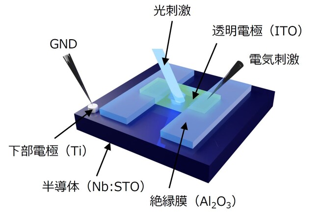 東京理科大学先進工学部物理工学科の木下健太郎教授、同大学大学院理学研究科応用物理学専攻の山崎悠太郎氏(2023年度修士課程2年)の研究グループは、透明電極のSnドープIn2O3(ITO)、光刺激と電気刺激の両者に対して導電性が変化するNbドープSrTiO3(Nb:STO)から構成されるITO/Nb:STO接合の光メモリスタデバイスを作製し、光照射により誘起される電流の緩和時間を電気的に制御できることを実証しました(図1)。