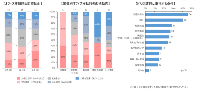 直近1年以内にオフィス移転を行った、または現在検討中の企業に対し、「オフィス移転時の面積動向」について調査したところ、「大幅な増床」の割合が前回・前々回調査から大きく上昇、「大幅な増床」、「増床」で全体の50%を占める結果となった。コロナ収束後の出社回帰や業績向上などが影響し、増床に踏み切る企業が増加しているものと思われる。一方、減少も30%前後で安定的に推移しており、拠点の集約統合やコスト削減のニーズも底堅いと考えられる。