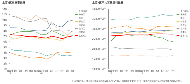 三菱地所リアルエステートサービス株式会社(本社:東京都千代田区大手町1-9-2、代表取締役社⾧:湯浅哲生)は、2023年7月度の東京主要7区(千代田区、中央区、港区、新宿区、渋谷区、品川区、江東区)の大規模ビル※1のマーケットデータをまとめた「空室率レポート」を本日、8月9日に公表します。