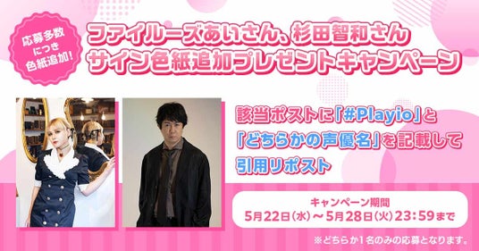 株式会社凸(デコ)(本社:東京都渋谷区、代表取締役:長谷川秀樹、以下 凸)は2024年5月14日(火)から2024年5月21日(火)に開催された「Playio」サービスサイトおよびサービス紹介動画のナレーションを担当されたファイルーズあいさん、杉田智和さんの「サイン色紙プレゼントキャンペーン」は多数の応募を頂きました。つきましては、本日2024年5月22日(水)より「サイン色紙追加プレゼントキャンペーン」を開催することとなりました。