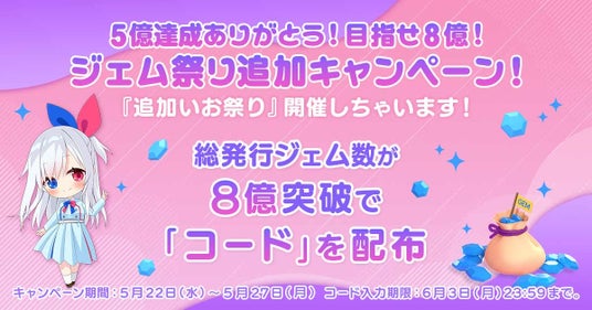 また、2024年5月14日(火)から開催中の「Playio いおのジェム祭り」において、総発行ジェム数が当初の予定よりも早く目標数に到達したため「5億達成ありがとう!目指せ8億!ジェム祭り追加キャンペーン」の開催を決定いたしました。