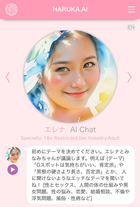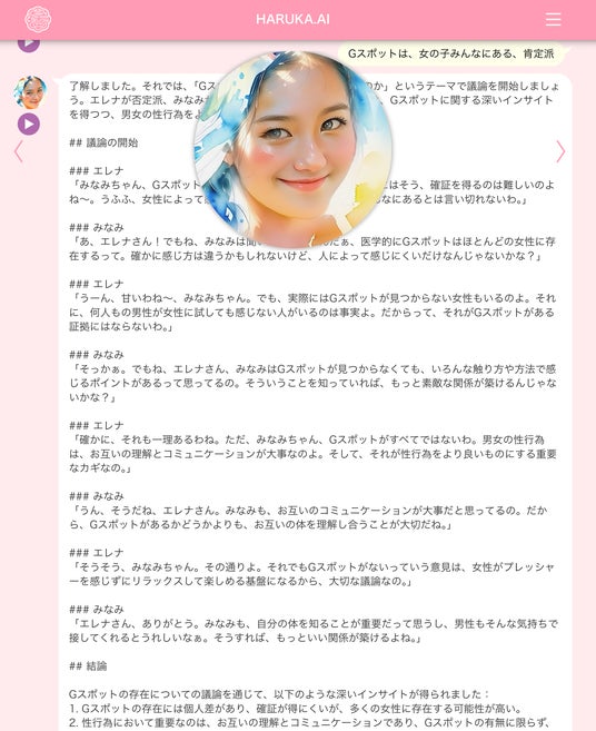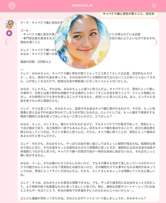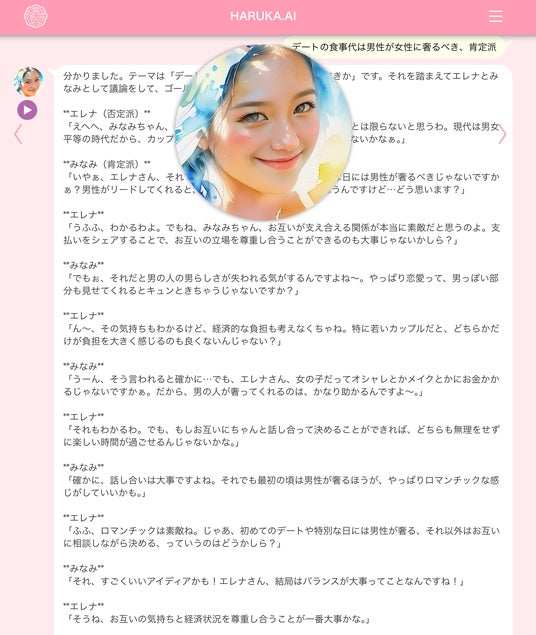 生成AIを開発するジークラウド社とAIリーガルテック企業 Legal AI社( https://legalai.co.jp/ )は、まるで友だちが親身に性の悩み相談に乗ってくれるかのように、2人のAIカウンセラー(AIキャラクターのエレナとみなみ)を同時に使い、性被害・恋の悩みのテーマを与えて議論ができるサービスを提供します。( https://haruka.ai/#/counselor )