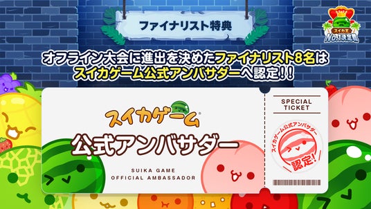 オンライン予選期間中に記録された月間のマイスコア上位3ゲーム分の数値を合算し、合計数値の高かった上位8名はファイナリストとして7月27日(土)にベルサール秋葉原で行われる「スイカゲーム 夏のスイカ大収穫祭」の「スイカ王No.1決定戦」決勝大会に参加することができます。ファイナリスト8名を「スイカゲーム公式アンバサダー」に認定し、様々な特典をご提供予定です。