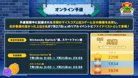 オンライン予選(※1)は、Nintendo Switch(TM)︎版/iOS版/Android版から参加が可能(※2)。予選期間中に記録された月間のマイスコア上位3ゲーム分の数値を合算し、合計数値の高かった上位8名がファイナリストとして7月27日(土)にベルサール秋葉原で行われる「スイカゲーム 夏のスイカ大収穫祭」の「スイカ王No.1決定戦」決勝大会に参加することができます。