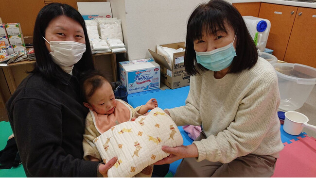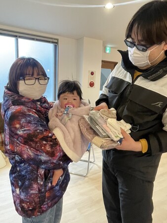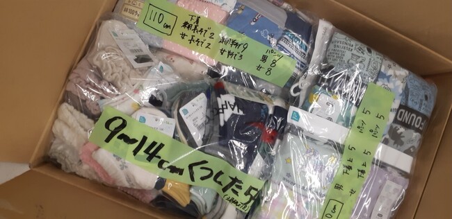 現在の被災地の状況や子育て世帯が抱えているニーズとして、水道の復旧が少なくとも3月いっぱいまでかかることや子ども達の下着やよだれかけが不足して困っていることなどを伺い、「子ども第三の居場所同士」少しでもお力になれればという思いから、下着や靴下、ズボンなどの子ども服とベビー用のよだれかけやガーゼハンカチ、タオルなどの新品をキリンこども応援団で購入し、じっくらあと様へ向けて発送させていただきました。