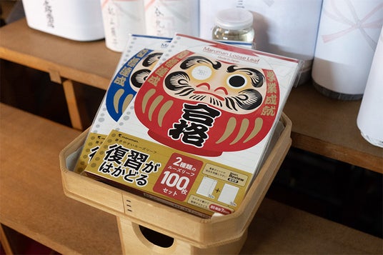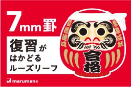 高品質でストレスなく書ける「書きやすいルーズリーフ横罫」とポイントを見返しやすく書 ける「スマートレビュー復習罫」、マルマンの“復習がはかどる”ルーズリーフ2種類をセット にし、受験生への合格祈願の想いを込めて、ダルマのモチーフをパッケージに施しました。
