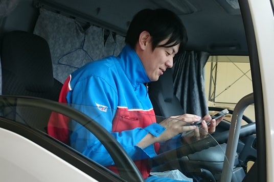 スマートフォンでATMTCアプリを操作するトラックドライバー