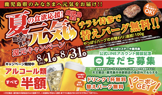 鹿児島県のやっぱりステーキ店舗「鹿児島中央駅前店」「天文館店」で超お得なキャンペーンを実施します。