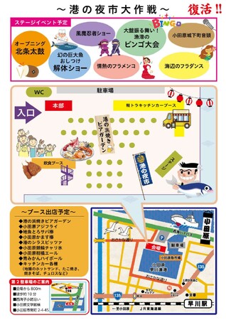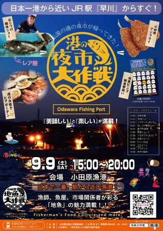 小田原漁港周辺の鮮魚店、飲食店、卸業に携わる若手水産関係者によって構成された「小田原地魚大作戦協議会」が主催する小田原漁港では珍しい夜のイベント「港の夜市大作戦」を4年ぶりに開催します。
