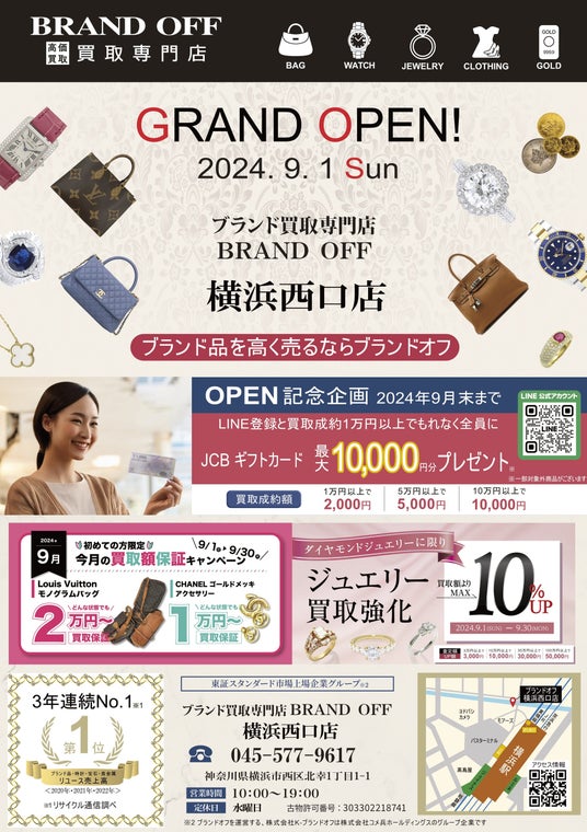 中古ブランド品のバッグ・時計・宝飾品などを扱うブランドリユースシェアNo.1(※)のコメ兵ホールディングスグループの一翼である株式会社K-ブランドオフ(石川県金沢市)は、神奈川県横浜市にFC38店舗目となる「ブランド買取専門店 BRAND OFF 横浜西口店」をオープンいたします。 ※ 「リユース市場データブック2023」((株)リフォーム産業新聞社調べ)