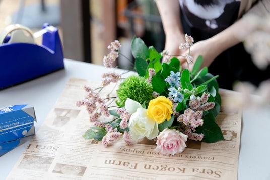 ローズマルシェにて花束アレンジの様子(※花束のばらはイングリッシュローズではありません)