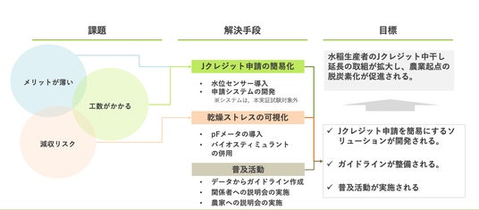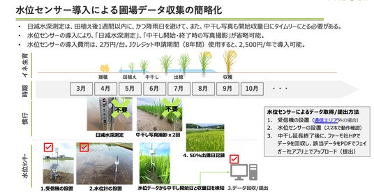 本実証を通し、1.水位センサーの導入により、J-クレジット水田中干し延長の圃場データ取得の作業工数を軽減することが可能であること、2.水田中干し延長による乾燥ストレスを可視化するツールの検証を行い、活用可能であることを確認しました。