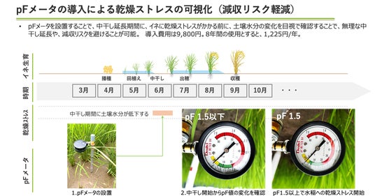 「pFメータの導入により、稲にかかる乾燥ストレスを可視化できたことは、中干しの延長をする際の目安となり、安心して中干し延長が実施できた。」