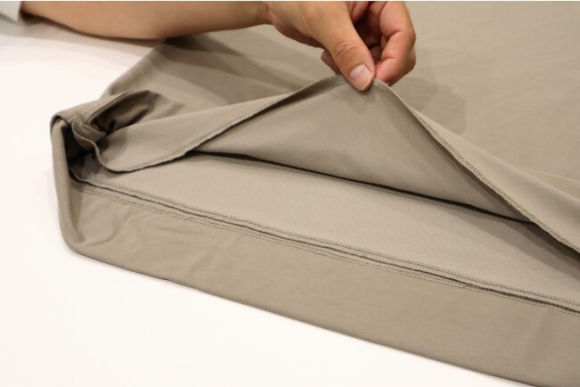 その他デザインにおいては、Tシャツのネック部分の襟を高く設計し、ジャケットの襟を汚れにくくしています。さらに、袖の裾部分を少し絞ることでジャケットの袖通しを良くする工夫を施すなど、ビジネス用として仕立てたTシャツです。
