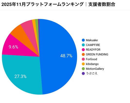 支援者数においては、Makuakeが約10.3万人(シェア48.7%)でトップとなり、CAMPFIREが約5.8万人(シェア27.3%)で続きます。Makuakeは1プロジェクトあたりの平均支援者数が多く、新商品デビューの場としての認知が一般層にも深く浸透していることが伺えます。