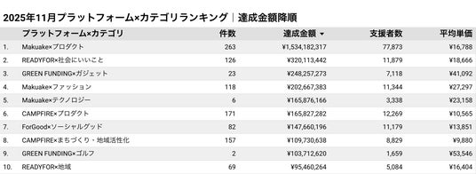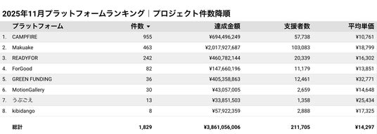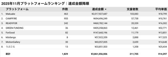 株式会社cracoでは、クラウドファンディング市場の透明化と発展への寄与を目的に、毎月国内主要プラットフォームのプロジェクトデータを独自に収集・分析しています。本レポートは、2025年11月1日から11月30日までの期間に終了したプロジェクトを対象に、資金調達額や支援者数などの主要指標をランキング形式でまとめたものです。