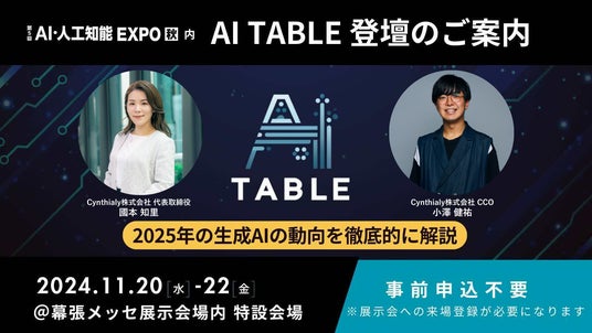 法人向けの生成AI人材育成・導入変革支援を行うCynthialy株式会社(所在地:東京都渋谷区、代表取締役:國本知里、以下Cynthialy)は、AI ・人工知能 EXPOにてAINOW主催の「AI Table」に、代表の國本・CCO小澤が登壇することをお知らせいたします。