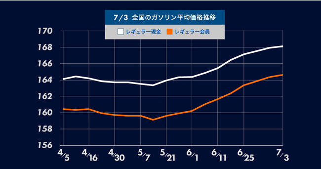 7月3日(月) 時点のレギュラーガソリンの全国平均は、168.1円となり先週から1.1円の値上がり。7週連続の値上がりとなりました。