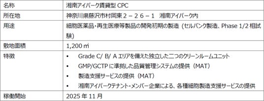 アイパークインスティチュート株式会社(以下「アイパークインスティチュート」)は、Minaris Advanced Therapies(以下「MAT」)および、日立グローバルライフソリューションズ株式会社(以下「日立GLS」)との協業により、湘南ヘルスイノベーションパーク(略称:湘南アイパーク)内にGMP(※1)/GCTP(※2)に準拠した「細胞培養加工施設」(CPC:Cell Processing Center)を新設し、2025年11月に稼働することを本日、発表しました。