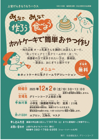 西日本を中心に16の生協で構成されている一般社団法人グリーンコープ共同体(本部:福岡市博多区、代表理事:日高 容子、以下グリーンコープ共同体)所属の社会福祉法人グリーンコープは、みんなの居場所「上官げんきもりもりハウス」(大牟田市一浦町)で、「ホットケーキで簡単おやつ作り」と題して、子どもたちがホットケーキに生クリームを使ってデコレーションする体験会を12月2日(土)に開催します。