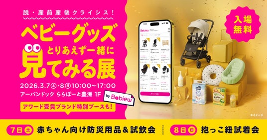 今最も参考にされている(※)ベビーグッズの口コミサイト「Babiew(べビュー)」を運営するBEFFY株式会社(本社:東京都渋谷区、代表取締役CEO:金木 りな)は、2026年3月7日(土)から8日(日)の2日間、アーバンドック ららぽーと豊洲 1階 ZARA前エリアにて、リアルイベント「脱・産前産後クライシス!ベストベビーグッズとりあえず一緒に見てみる展 by Babiew」を開催いたします。