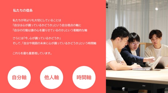 「心躍る+」を目標に、私たちは“自分軸”、“他人軸”、“時間軸”を持つことを重要視しています。