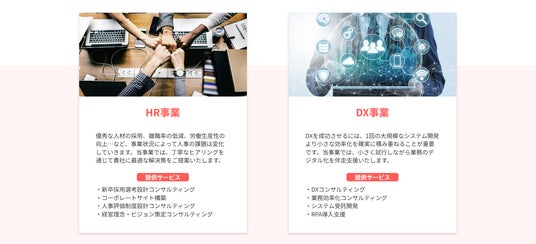 人事制度を起点として組織力を強化するヒューマンリソース(HR)領域、業務のデジタル化を通じて自動化・省力化を推進するデジタルトランスフォーメーション(DX)領域を軸として、企業の生産性を向上するご支援をしています。