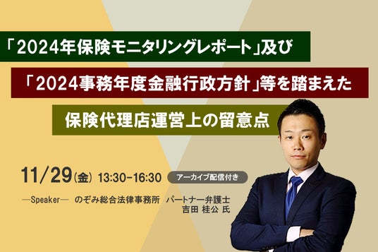 講師には、のぞみ総合法律事務所 パートナー弁護士 吉田 桂公 氏を迎え、「2024年保険モニタリングレポート」及び「2024事務年度 金融行政方針」や、最新の法改正・監督指針の改正の動向、「最善利益義務」等を踏まえた保険代理店運営上の留意点について解説していただきます。