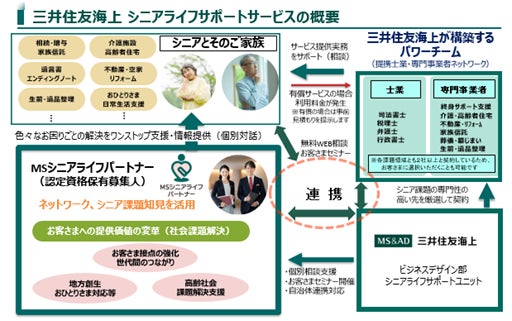 具体的には、三井住友海上の独自資格である「MSシニアライフパートナー」の認定を受けた保険代理店に所属する保険募集人(以下「パートナー」)が、お客さま・相談者のうち、身元保証・終活支援・高齢者入居問題等のシニア世代特有の悩みでお困りの方に対し、身元保証サービス等を提案・提供していきます。