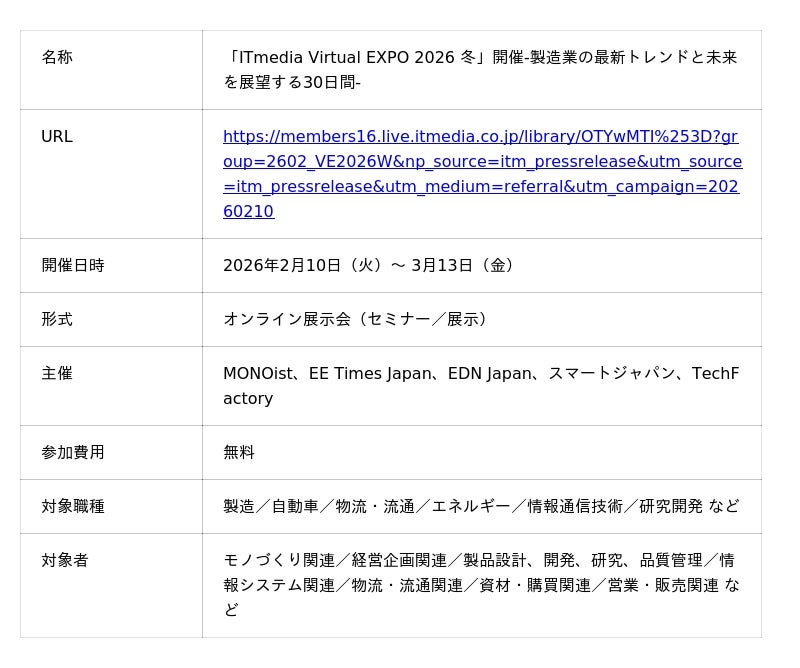アイティメディア株式会社(本社:東京都千代田区、代表取締役社長 兼 CEO:小林教至、以下アイティメディア)は、2026年2月10日(火)~ 3月13日(金)に「ITmedia Virtual EXPO 2026 冬」を開催します。本イベントは、「MONOist」「EE Times Japan」「EDN Japan」「スマートジャパン」「TechFactory」の5媒体が主催する製造業向けのオンライン展示会で、事例紹介や専門家の講演といった多様なコンテンツを通じて、製造業の課題解決やモノづくりのプランニングに役立つヒントをお届けします。