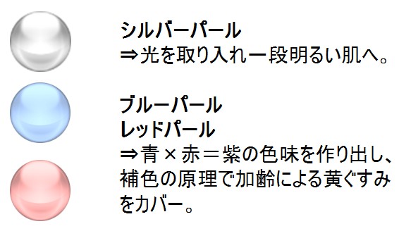 ブルーパール・レッドパール⇒青×赤=紫の色味を作り出し、補色の原理で加齢による黄ぐすみをカバー。