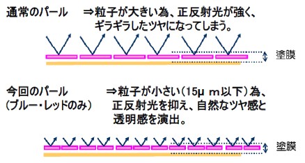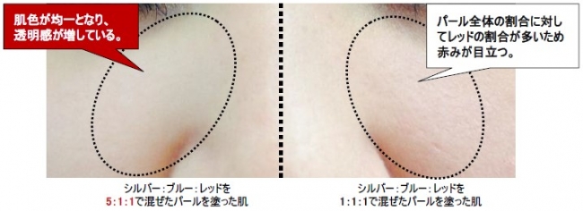また、各色のパールの配合率を追究した結果、肌を最も美しく見せるパールの配合率は「シルバー:ブルー:レッド=5:1:1」であることが判明いたしました。色・大きさの違うパールをベストバランスで配合することにより「赤み」を抑え、肌を美しく仕上げることができます。