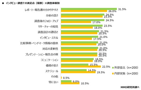 インタビュー調査を実施している企業に勤める300人を対象に、実施したインタビュー調査の満足点について聞いたところ(複数回答可)、外部委託(n=200)と内部実施(n=200)ともに「レポート・報告書の分かりやすさ」がそれぞれ最多となり、外部委託は31.5%、内部実施は26.0%となった。