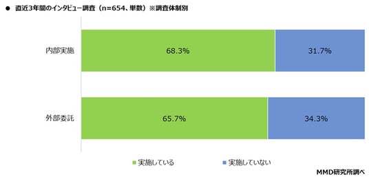 次に、調査を実施したことがあると回答した2,542人のうち、インタビュー調査を実施した654人を対象に、調査体制別でのインタビュー調査の実施有無について聞いたところ、「実施している」と回答したのは内部実施では68.3%、外部委託では65.7%となった。