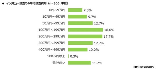 予備調査から抽出したインタビュー調査を実施している企業に勤める300人を対象に、1回あたりのインタビュー調査での平均的な調査対象者数、調査費用、調査期間を聞いたところ、調査対象者数は「10人」で17.7%、調査費用は「100万円~199万円」で18.0%、調査期間は「2ヶ月~3ヶ月未満」で31.0%とそれぞれトップとなった。