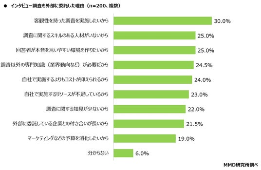 インタビュー調査を外部委託で実施している企業に勤める200人を対象に、外部委託した理由について聞いたところ(複数回答可)、「客観性を持った調査を実施したいから」が30.0%と最も多く、次いで「調査に関するスキルのある人材がいないから」と「回答者が本音を言いやすい環境を作りたいから」が25.0%となった。