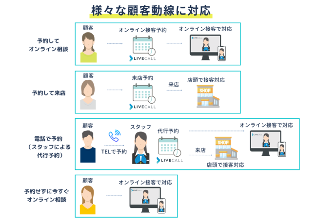 LiveCallはオンライン相談予約と来店予約に加え、予約せずに今すぐオンライン相談できる導線や、電話での予約受付(スタッフによる代行予約)などにも対応でき、あらゆる顧客導線を網羅しています。お客様は自分の都合や好みに合わせて利用することができ、店舗側も顧客のニーズに柔軟に対応できます。