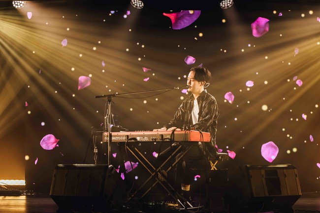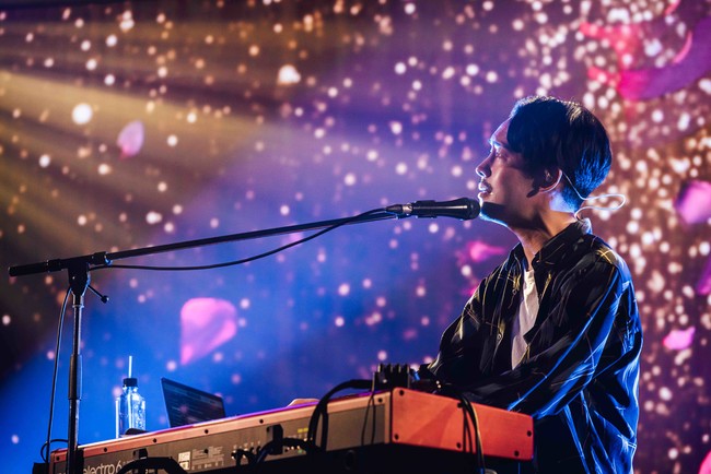 次に後半戦3番手として、ソロとしてもマルチプレイヤーとしても音楽シーンに存在感を放つTENDREが登場。柔らかなエレピの調べとともにスタートしたライブパフォーマンスでは、LEDスクリーンの舞い散る桜を背に春を思わせる曲が数多く披露された。特に叙情的なメロディと伸びやかな声に会場がつつまれる中、披露されたしっとりした弾き語り曲「DOCUMENT」は、その雰囲気も相まって、来場者全員を魅了。TENDREが奏でるエモーショナルな音楽が心地よい空間を生み出していた。