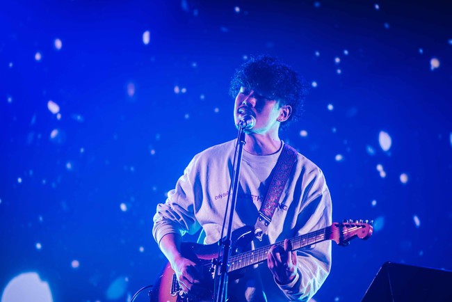 次に前半戦3番手として、早耳リスナーからも話題を集める新進気鋭のシンガーソングライターHiplinがギター1本での弾き語りスタイルで登場。 1曲目からしっとりした美しい歌声とギターの音色で来場者の心を掴むと、その後も思わず吐息がもれるようなウェルメイドな音楽を披露。演出のLEDスクリーンから舞い散る桜も相まってまるで春の夜の夢のような雰囲気が漂う中、出会いと別れの季節を思わせるセンチメンタルかつエモーショナルな曲で、来場者の感情を揺さぶった。