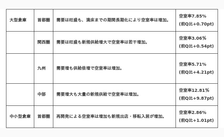 首都圏 大型倉庫/需要は旺盛も、満床までの期間長期化により空室率は増加。中小型倉庫/再開発による空室率は増加も新規出店・移転入居が増加。