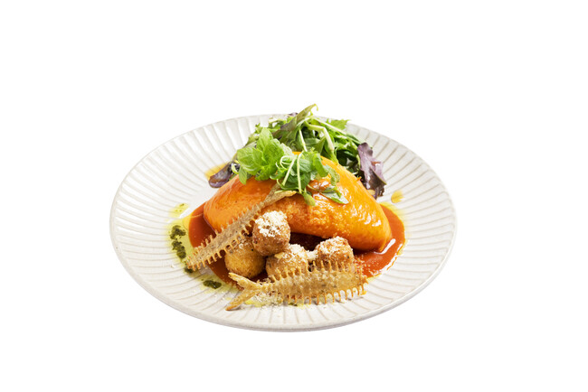 海老を身から殻までまるごと余すことなく使用したオムライス。さっぱりとしたアメリケーヌソースは、トマトケチャップを使用することで、短時間でもコクのあるソースに仕上げている。チキンライスやトッピングのチュイールには石川産のお米やレンコンを、塩は能登産のものを使用し、食材も見た目も北陸らしい一皿。