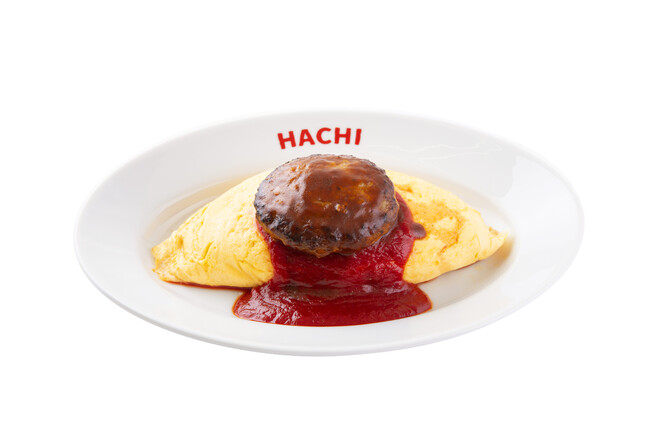 黄身の濃い、宮城県産の赤卵を使用。炊き上げたターメリックライスと自家製トマトソースで作るチキンライスは、ふわとろ食感のオムライスにぴったり。HACHI創業以来の看板メニューのハンバーグをのせたボリューム満点のオムライス。
