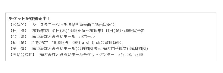 2015年はロシアの国民的作曲家、ショスタコーヴィチの没後40年、2016年は生誕110年という節目の年です。12月31日の大晦日、モルゴーア・カルテットによる年跨ぎの全曲演奏プロジェクトが、横浜みなとみらいホールで開催されます。一度しか味わえないスペシャルな年越しをみなとみらいで!