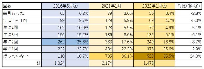 また、2016年の調査では、「年に2回行った(25.6%)」という回答が最も多かったのに対し、今回の調査では、「行っていない(35.5%)」が最も多く、次いで「年1回(25.6%)」となり、お墓参りへ行く回数も減っていることがわかった。